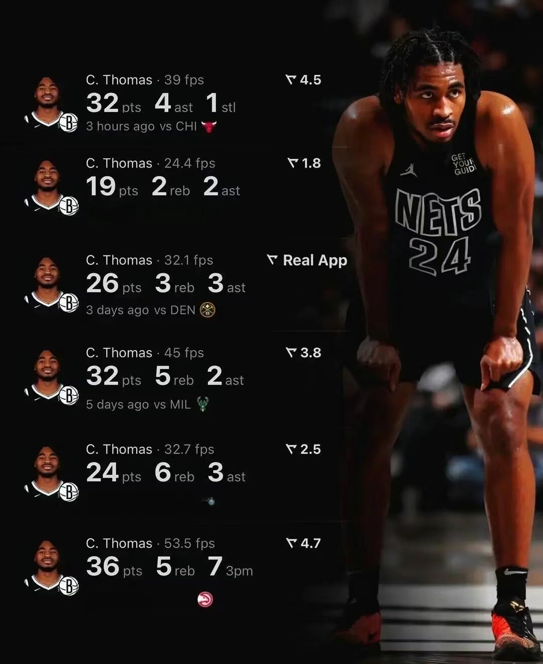 作为 2021 年首轮 27 号秀,托马斯在篮网的四个赛季里稳步成长,常规赛场均出战 23.2 分钟能贡献 15.1 分 2.6 篮板 2.1 助攻,三项命中率 43.9%/34.5%/85%,尤其是近两个赛季,他更是扛起篮网进攻大旗。